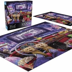Night at the Drive-In is a 1000-piece jigsaw puzzle from the Vivid Series by Buffalo Games. This puzzle depicts a fun night at a drive-in movie theater featuring the film, βZombie Catsβ. The movie goers appear cozy and relaxed in their vehicle with essential movie snacks like popcorn and soda. To top it off, they are wearing their pajamas and fuzzy socks and slippers.