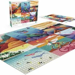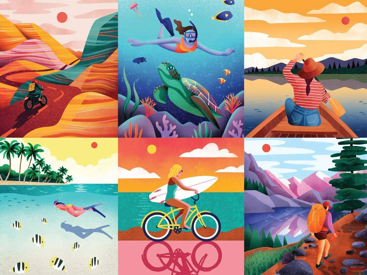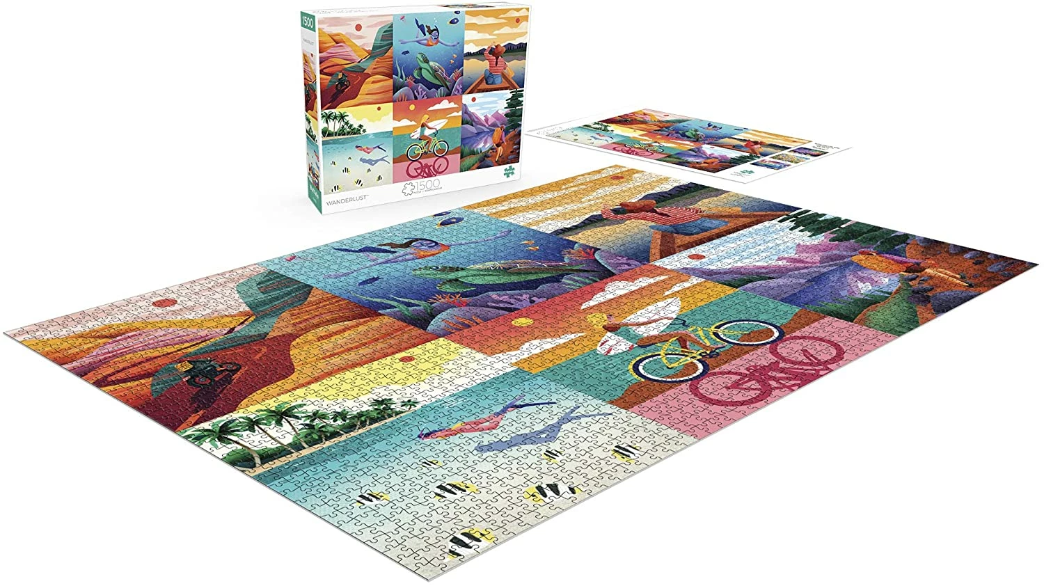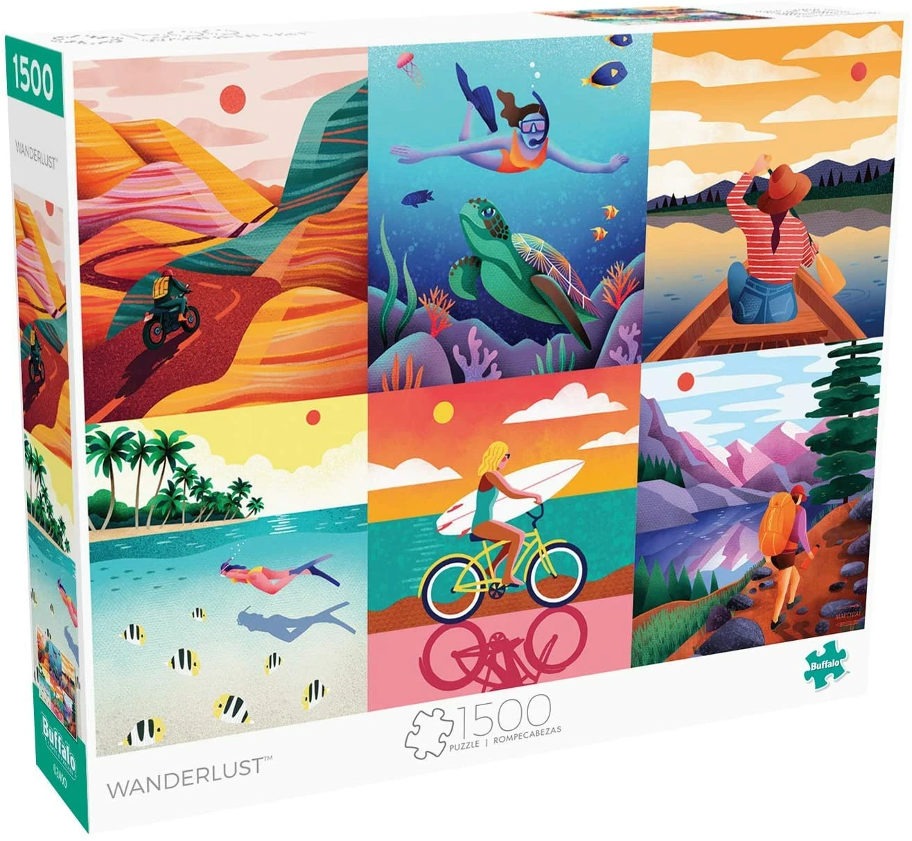 Have you recently had the urge to travel? To get away from it all? Witness people in their moments of wanderlust, as they swim, climb, bike all in the effort to explore this vast world. This 1,500 piece-jigsaw puzzle is titled Wanderlust and is by Buffalo Games.Β