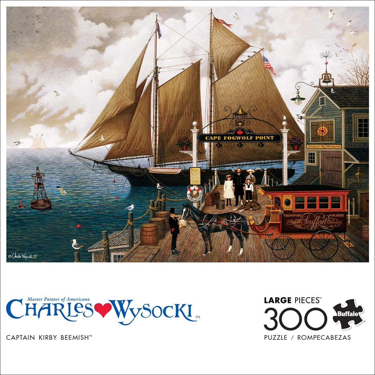 Visit Cape Fogwolf Point in this 300-large piece jigsaw puzzle, Captain Kirby Beemish, by Buffalo Games from the work of artist Charles Wysocki. A clipper ship is docked at port waiting on its next adventure. The captain and his family pose in front of the ship with their dog while a carriage driver feeds his horse.
