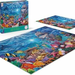 Take a plunge to the sea floor and you might find some buried treasure in this Ceaco puzzle. Dolphins and fish swim around a colorful coral reef. Piece together a glittering chest full of forgotten treasures. The completed puzzle will measure 26.6″ x 19″.