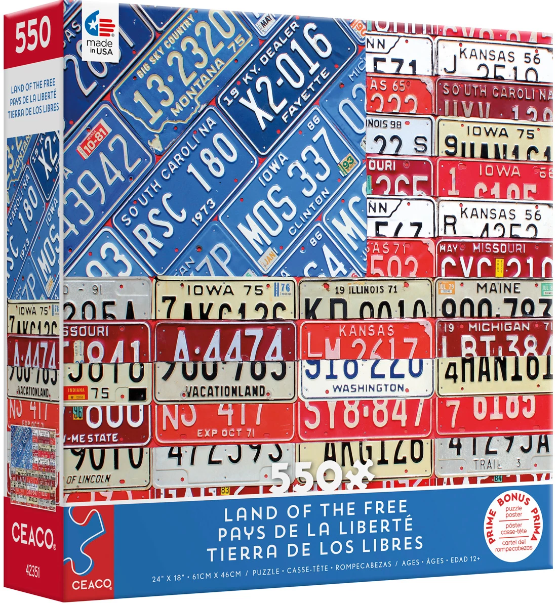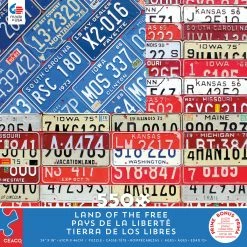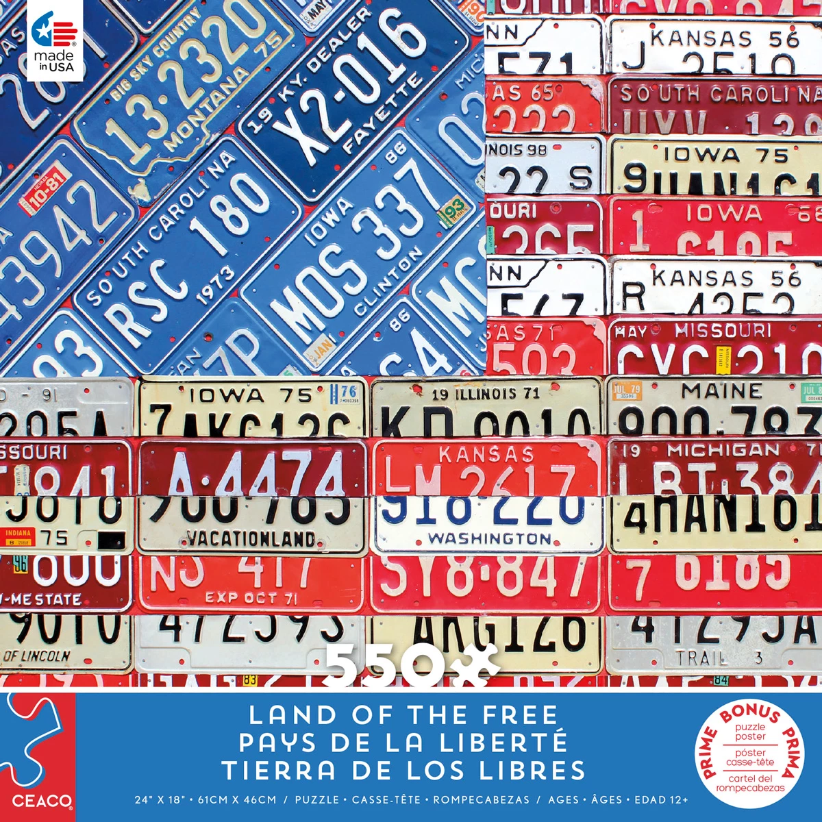 This 550 piece USA License Plates puzzle features a collage of licenses plates from all over the country placed so that it looks like an American flag. The puzzle has a red, white and blue color palette and its dimensions are 24″ x 18″.