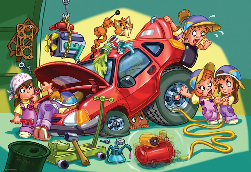 Mechanics is a 100 piece jigsaw puzzle in the Go Girls Go! series from EuroGraphics. Puzzle measures 13″ x 19″ when complete. The Go Girls Go! line of puzzles are great for the kiddos! They feature funny cartoon images of girls doing everything from flying planes to learning ballet to being mechanics and teachers!