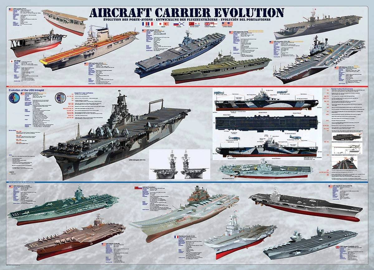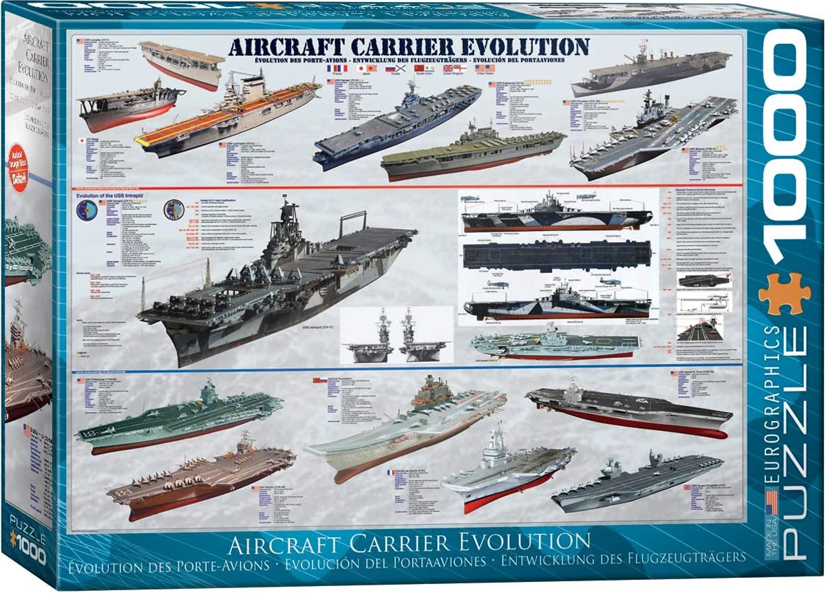 Aircraft Carrier Evolution is aΒ 1000 pieceΒ jigsaw puzzle from Eurographics. Aircraft carriers are some of the marvels of war transportation. This fascinating puzzle features over 10 aircraft carriers with detailed information about each. Some of the represented carriers are: USS Langley, USS Midway, Charles de Gaulle and a detailed evolution of the famous USS Intrepid. This superior quality puzzle will delight and educate all at the same time. Β Puzzle measuresΒ 26.5″ x 19.25″ when complete.