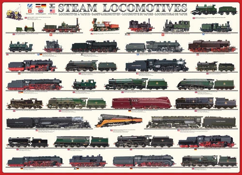 Steam Locomotives. 1000 piece puzzle. 26.5 x 19.25 inches. Steam locomotives from such countries as Bavaria, Switzerland, Germany, United Kingdom, Prussia and United States are beautifully illustrated. Includes informative facts on class, overall length, maximum weight and maximum speed. This superior quality puzzle will delight and educate all at the same time. Strong high – quality pieces that won’t break. Easy fit puzzle pieces. Made from recycled board.