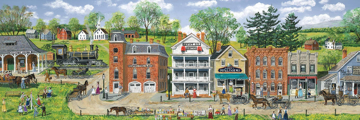 EuroGraphics Train Station by Bob Fair Panorama 1000-Piece Puzzle. Box size: 5″ x 14″ x 3.5″. Finished Puzzle Size: 13″ x 38″. Yesteryear comes to life as the train pulls into Newport Station right on time. What adventures await the newcomers.