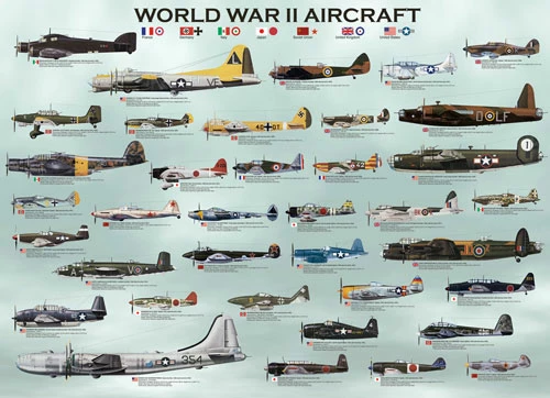 World War II Aircraft is a 1000 piece puzzle from Eurographics.ย This unique jigsaw puzzle features aircraft of both the Allied and Axis forces, including many of the greatest warbirds such as the Hurricane, the Supermarine Spitfire, the Messerschmitt BF – 109 and the Boeing B – 29 SuperFortress. This superior quality puzzle will delight and educate all at the same time. Puzzle measures 26.5″ x 19.25″ when complete.