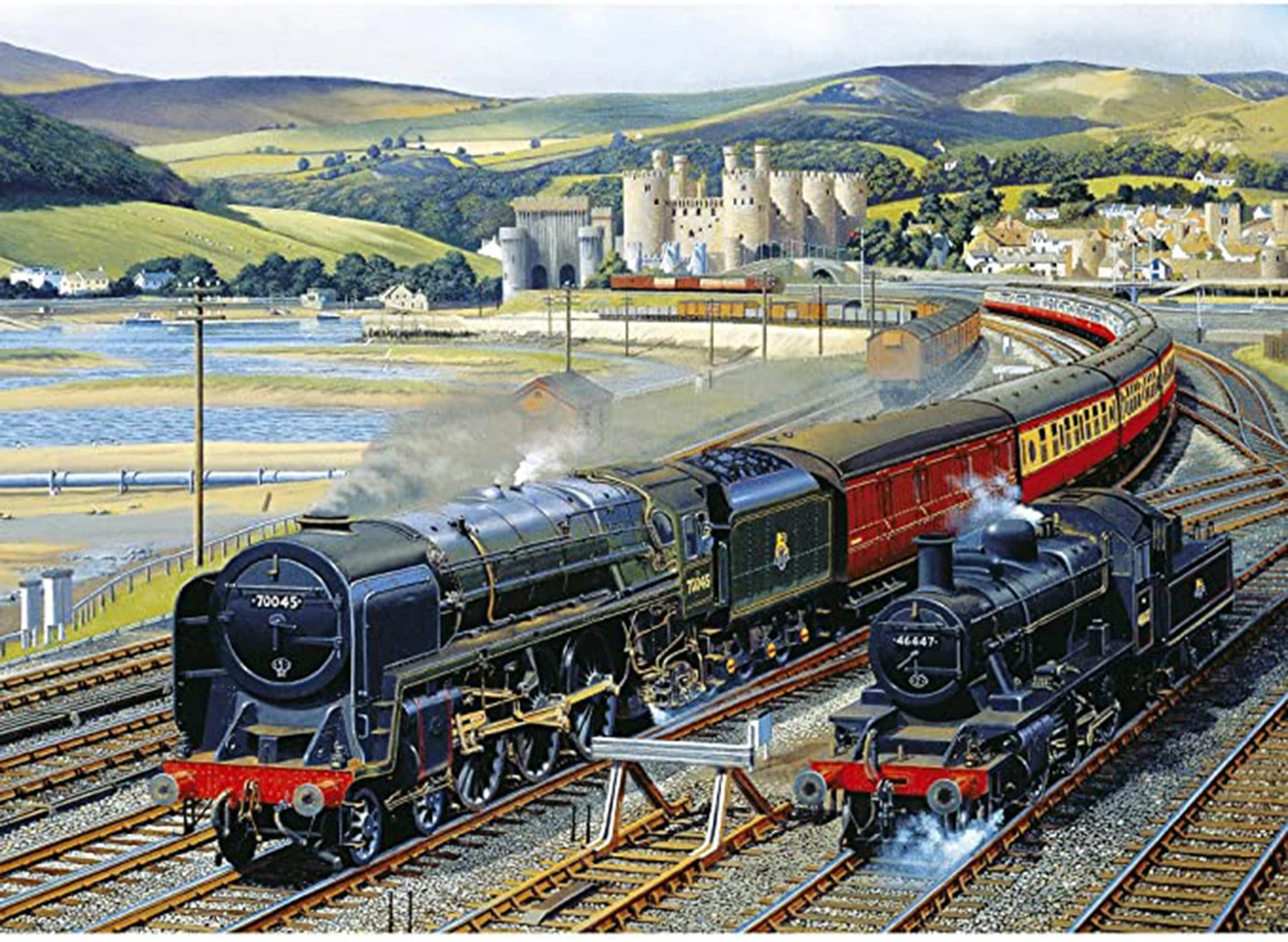Early morning on a bright day in the summer of 1957, against a backdrop on Conwy Castle and the estuary of the River Conwy, ‘Britannia’ class 4-6-2 No. 70045, soon to be named ‘Lord Rowallan’, coasts into Llandudno Junction station with an express from Holyhead to London. On an adjacent track, Ivatt class ‘2’ 2-6-0 No. 46447 departs for Llandudno Town to collect the daily pick-up freight. The ‘Britannia’ class ‘Pacifics’ were introduced by British Railways in January 1951. Altogether fifty-five were built, the last appearing in 1954. They had a comparatively short working life, the first being withdrawn in favour of diesel in June 1965. Two examples are preserved, Nos. 70000 ‘Britannia’ and 70013 ‘Oliver Cromwell’.