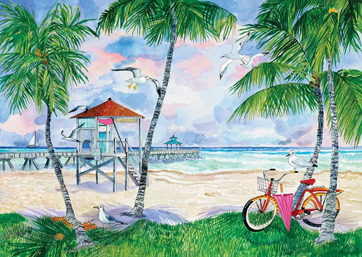 Bike to the Beach on a hot summer day. ย Enjoy this 550 piece puzzle as you reminisce about riding your bike to the beach in a tropical paradise.