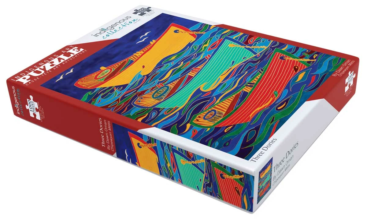 Three Dories by Dawn Oman – 1000 Piece Puzzle from Indigenous Art Puzzles. Artist’s are paid a royalty on every sale.