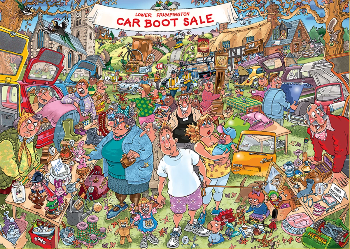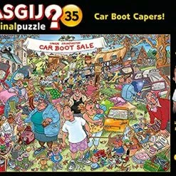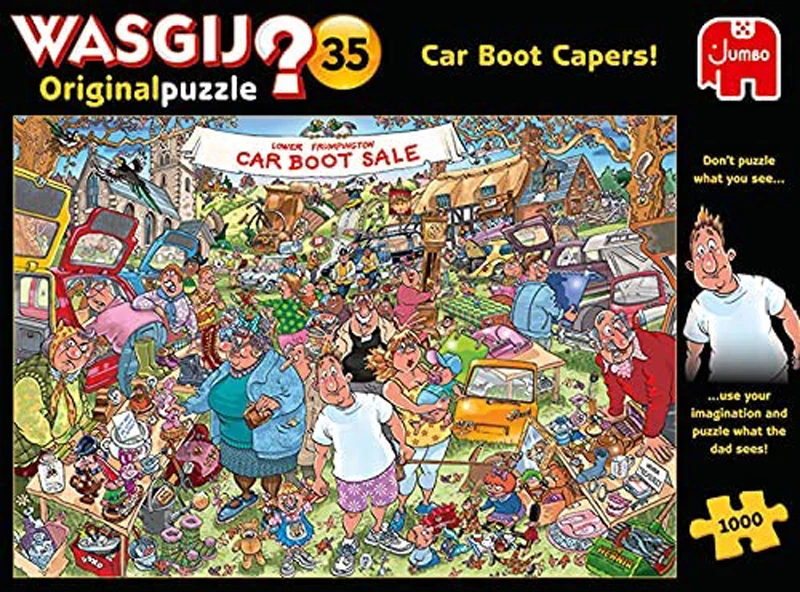 Wasgij Original 35: βCar Boot Capersβ is the title of this hysterically funny Wasgij Original 35, 1,000-piece puzzle. Itβs prime shopping time for bargain hunters at the Lower Frumpington Car Boot Sale with plenty of bobby-dazzling deals to be had. But something has caught the eye of our savvy shoppers and theyβre finding it hard to resist, leaving the stallholders fuming. But what could it be? This is the scene you will have to puzzle.