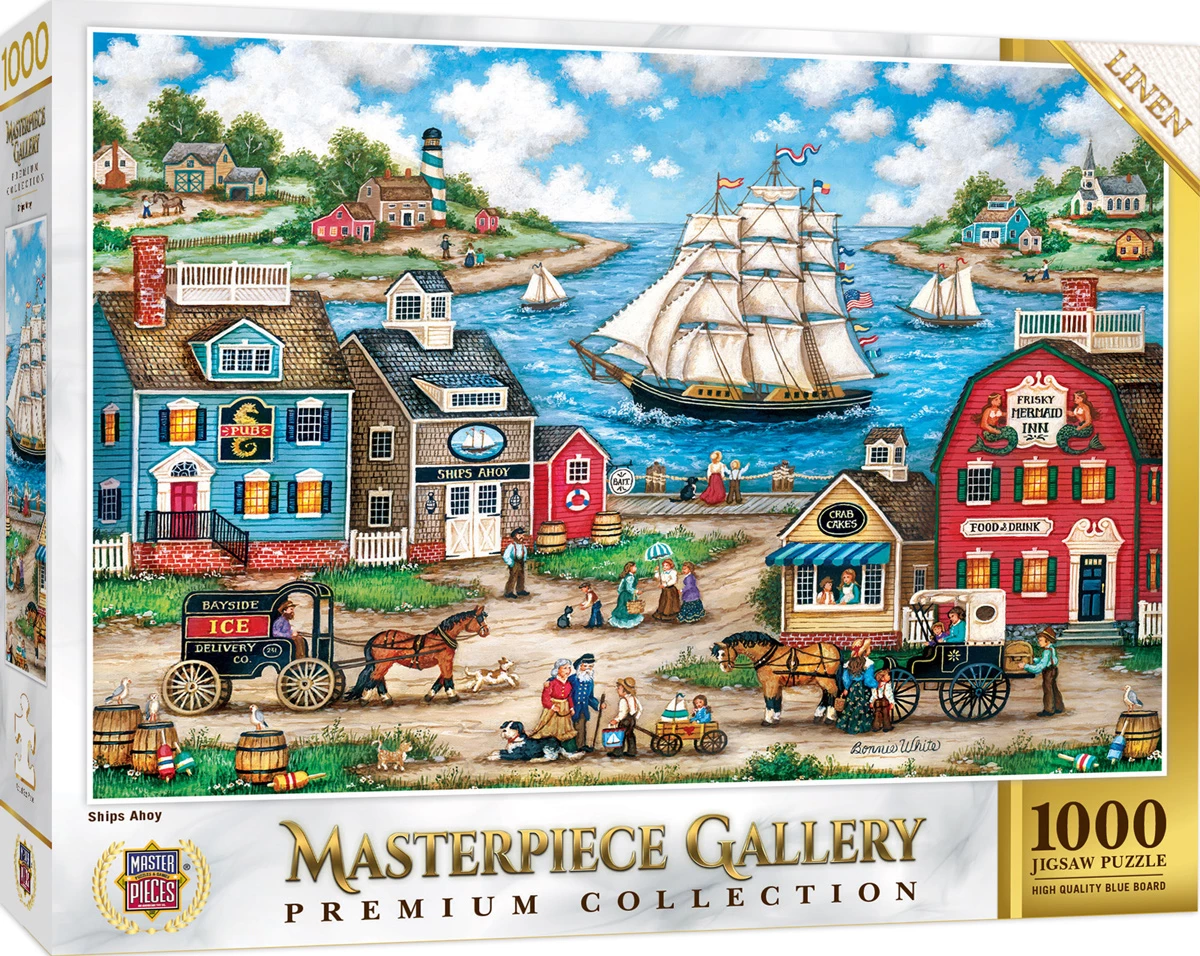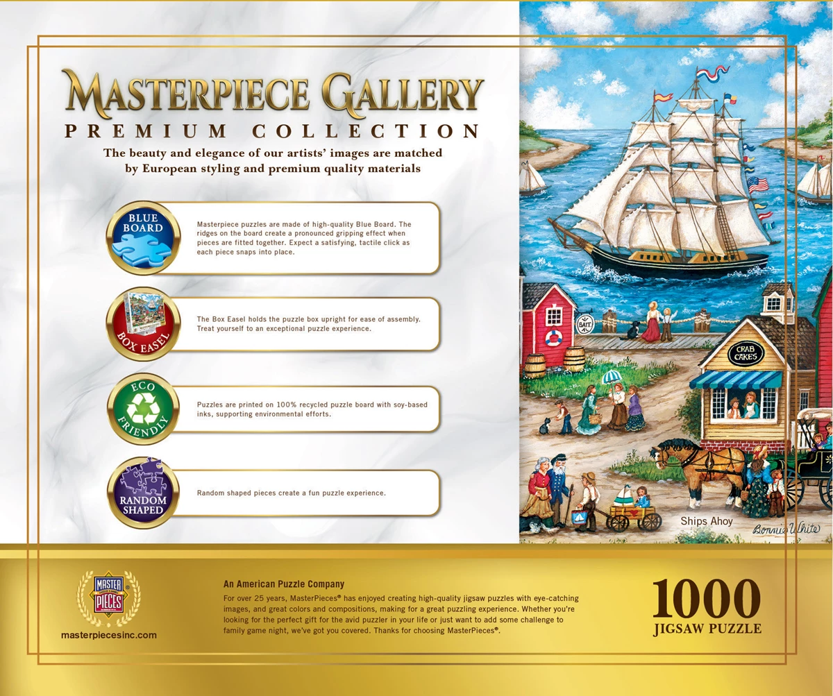 This Masterpieces 1000pc Puzzle of the ship coming in from sea as the town gathers to greet them is made on the highest quality recycled blue board and printed on linen paper for a shine-free easy-to-grip image and packaged in sophisticated linen-finish display boxes.