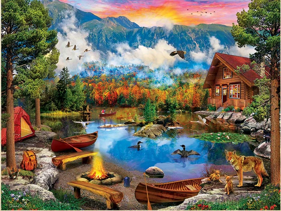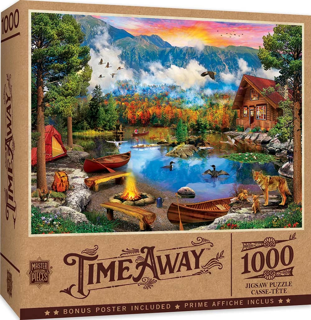 This MasterPieces 19.25″ x 26.75″ 1000pc Time Away Craft Paper Box Puzzle features an evening sunset at the campsite across the lake.