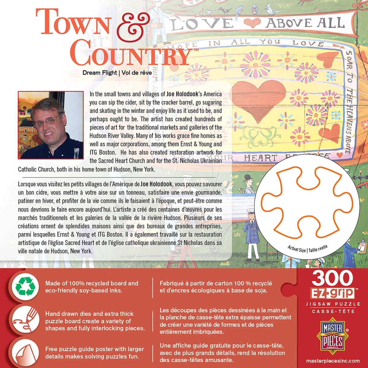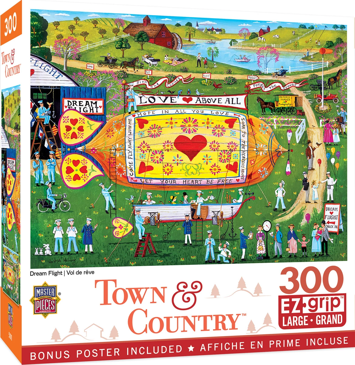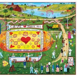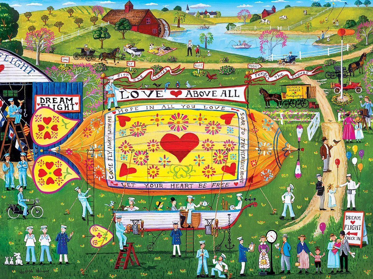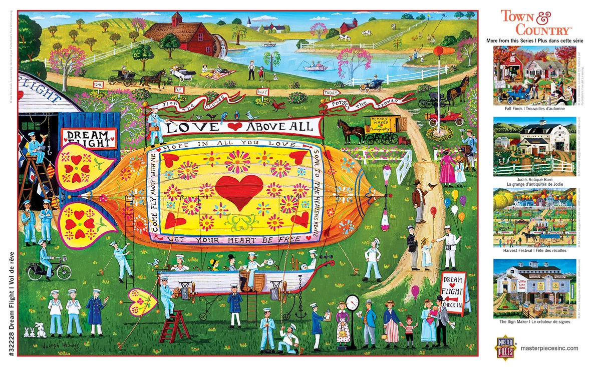 A custom hot air balloon takes flight for rides to all the local country folk across the way. This charming puzzle depicts a lovely summer day in the countryside. Whether you prefer a balloon ride or a picnic by the lake, there’s something fun for everyone.