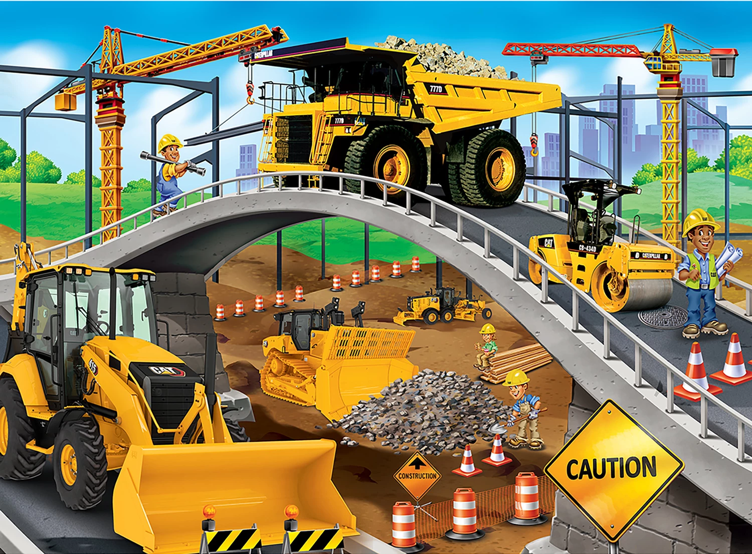 This Caterpillar puzzle features CAT construction equipment building a bridge! The dump truck clears away the rubble while the bulldozer clears a path. This puzzle is 60 pieces and 19 inches x 14 inches in size. Look for The Right Fitยฎ puzzles collection and make sure your little one gets the correct piece count and size for a good challenge for their age. This puzzle is the right fit for ages 5+.