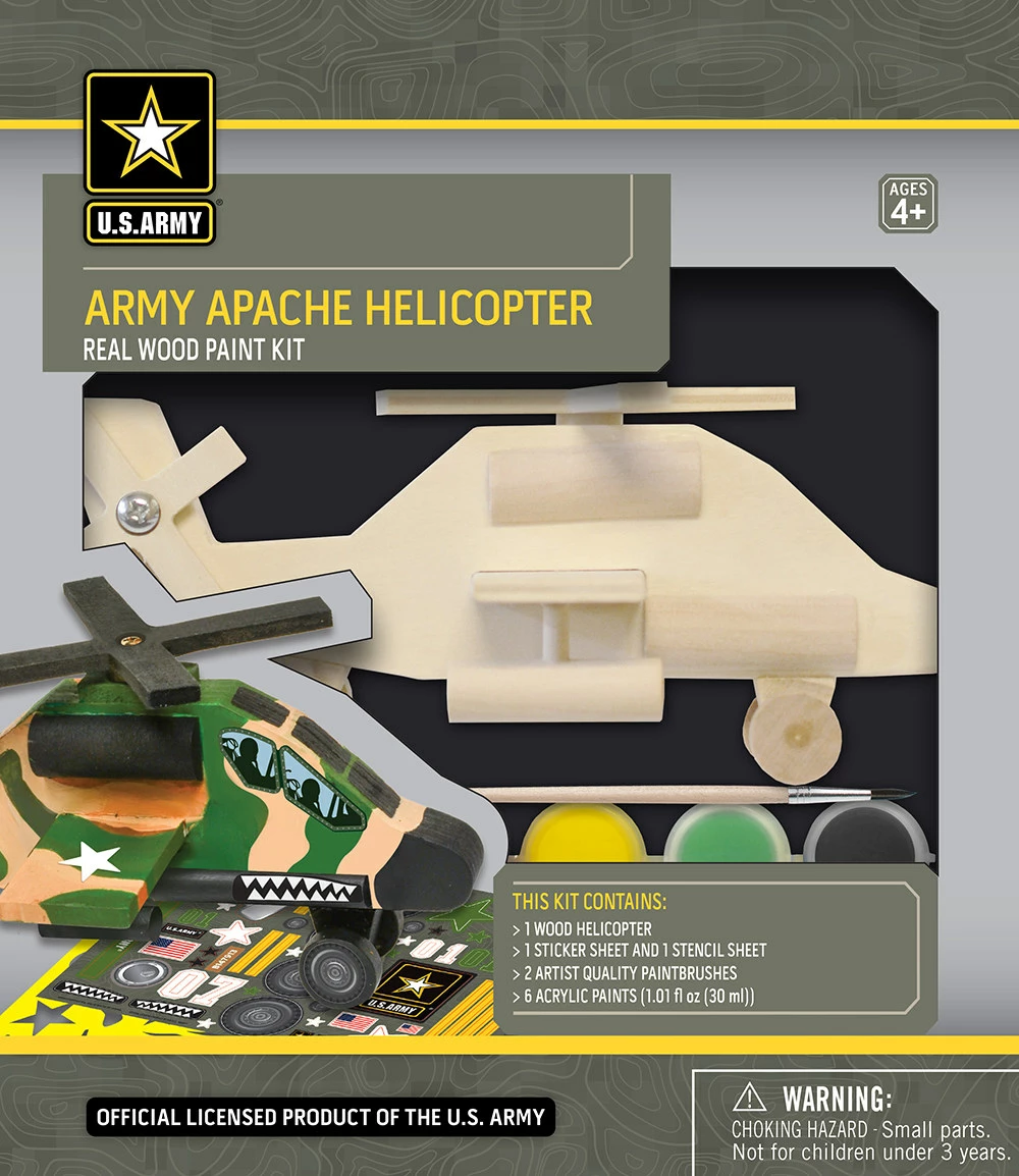 This Army Apache Helicopter Wood Craft & Paint Kit is made of real wood, and includes everything you need to create a beautiful work of art! The Army Apache Helicopter Wood Craft & Paint Kit is the perfect gift for every art loving kid! It includes 1 wood U.S. Army® Apache Helicopter, 1 sticker sheet, 1 stencil sheet, 6 non-toxic acrylic paint tubs, 2 artist-quality paintbrushes, and 1 instruction sheet with painting guide.