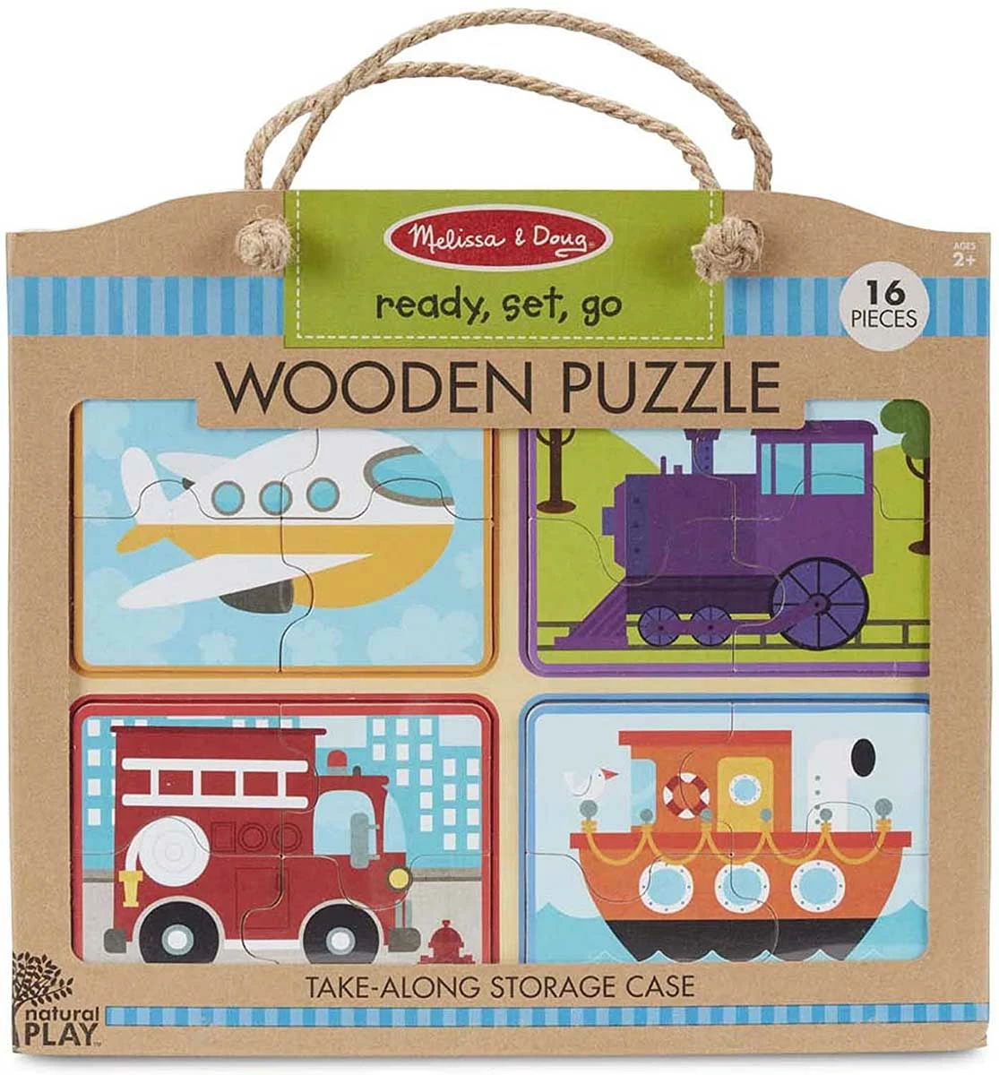 Travel across the world on four major transportation devices with this Melissa & Doug wooden children’s puzzle. As you put together the pieces, the vehicle starts to appear in its natural habitat. The 16 piece puzzle includes a ‘Take Along Storage Case’ for easy travel.