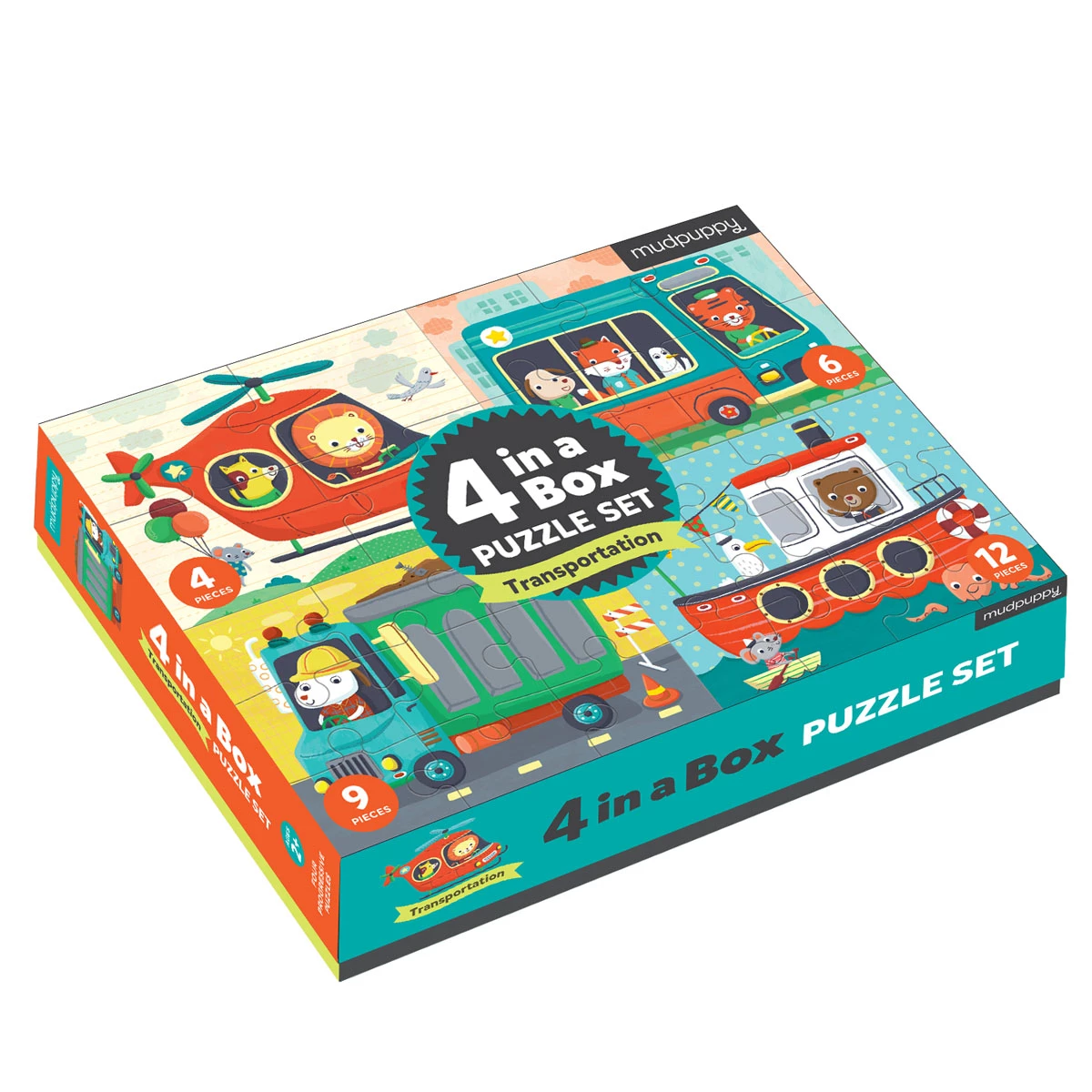 Transportation 4-in-a-Box Puzzle Set from Mudpuppy includes 4 puzzles, each with a different level of difficulty. Puzzles with 4, 6, 9 and 12 pieces reveal colorful illustrations of a helicopter, bus, truck and boat.