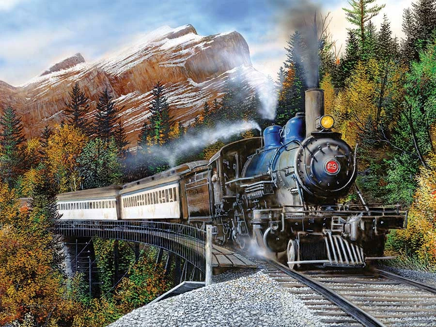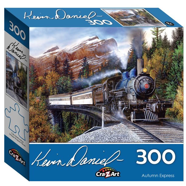 Kevin Daniels puzzles feature warm images of those quiet places and times that we all enjoy.Β Sometimes it a steam train on the edge of a mountain. Other times itβs a grandfather teaching a grandson to fish.Β But the puzzles are always colorful, clear and full of rich details. Kevin’s puzzles are warm and fun to assemble