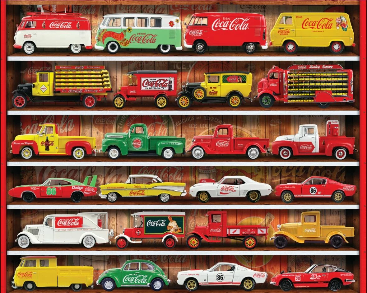 Put the pedal to the puzzle. A bumper-to-bumper collection of Coca-Cola bottle trucks, delivery vehicles, and muscle cars rev memories of glory days from touring town to town. Make sure you have a classic bottle to cheers your success when the last piece of 1,000 snaps into place. A fine addition to a showcase of Coca-cola diecast cars.