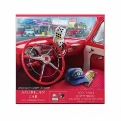 Get behind the wheel of a classic car in βAmerican Carβ from SunsOut. This cool car has a red interior complete with fuzzy dice! The artwork is from Greg Giordano. The 1000 piece puzzle features large pieces for easy handling and will measure 35β x 27β when complete.Β