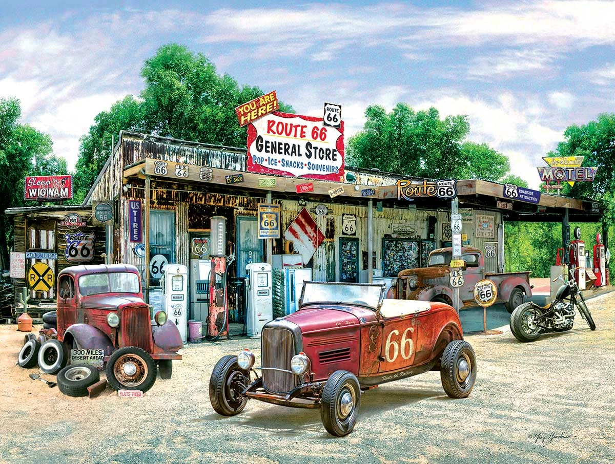 The Route 66 General Store is open for business in this nostalgic SunsOut puzzle. Greg Giordano brings you to a vintage gas station and motel in his artwork. The completed 300 piece puzzle will measure 24โ x 18โ.ย