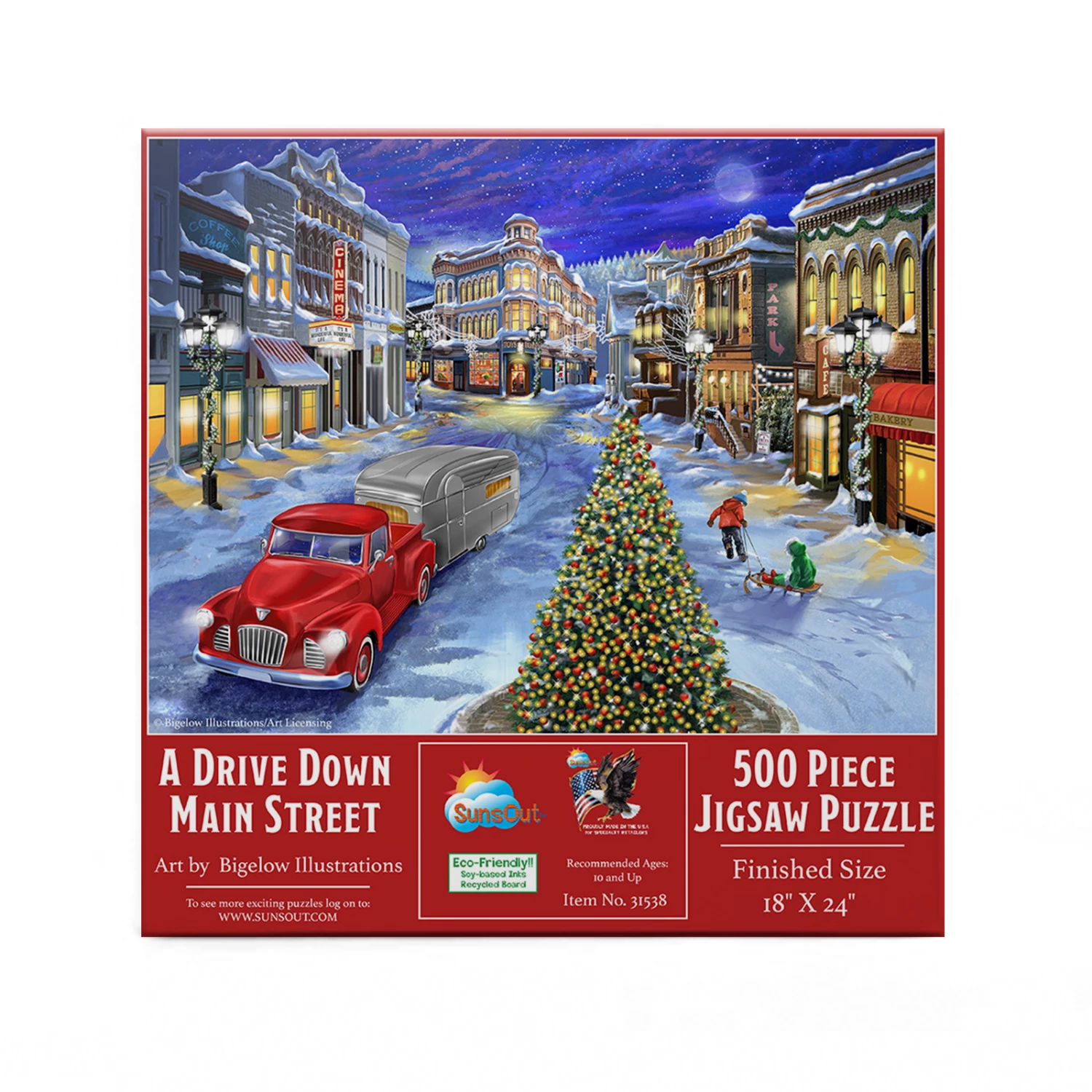 Get into the holiday spirit with SunsOut’s A Drive Down Main Street. This wintery 500 piece puzzle will transport you to a quiet town on Christmas Eve. You’ll have fun piecing together the gorgeous night sky and challenging tree in this fantastic puzzle.