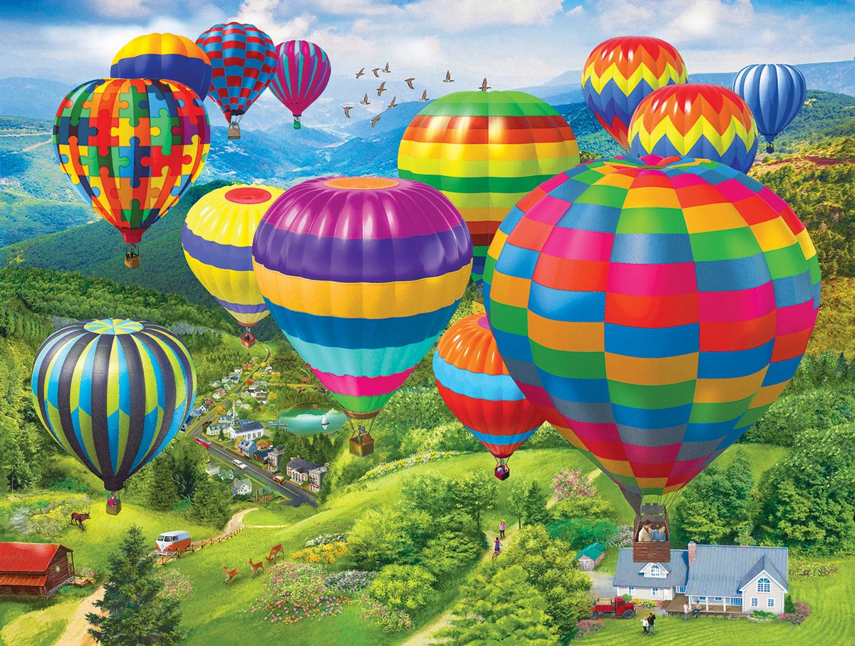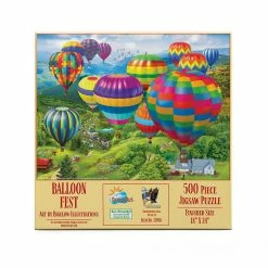 Fly high with this hot air balloon puzzle from SunsOut! Bigelow Illustrationsβ bright artwork makes this 500 piece puzzle a breeze to put together. With all the colorful balloons, youβll have a ton of fun. Thereβs even a puzzle piece balloon! The completed 500 piece jigsaw puzzle will measure 24β x 18β.Β