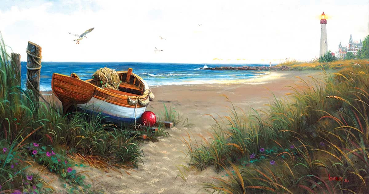 A calm beach is the focus of this 500 piece puzzle from SunsOut. βEvening at the Coastβ depicts a fishing boat that has been brought in for the evening. Seagulls fly along the shore looking for dinner while a lighthouse shines its beacon across the water. Mark Keathleyβs detailed art is calming and makes an excellent puzzle. The completed 500 piece puzzle will measure 29β x 15β.