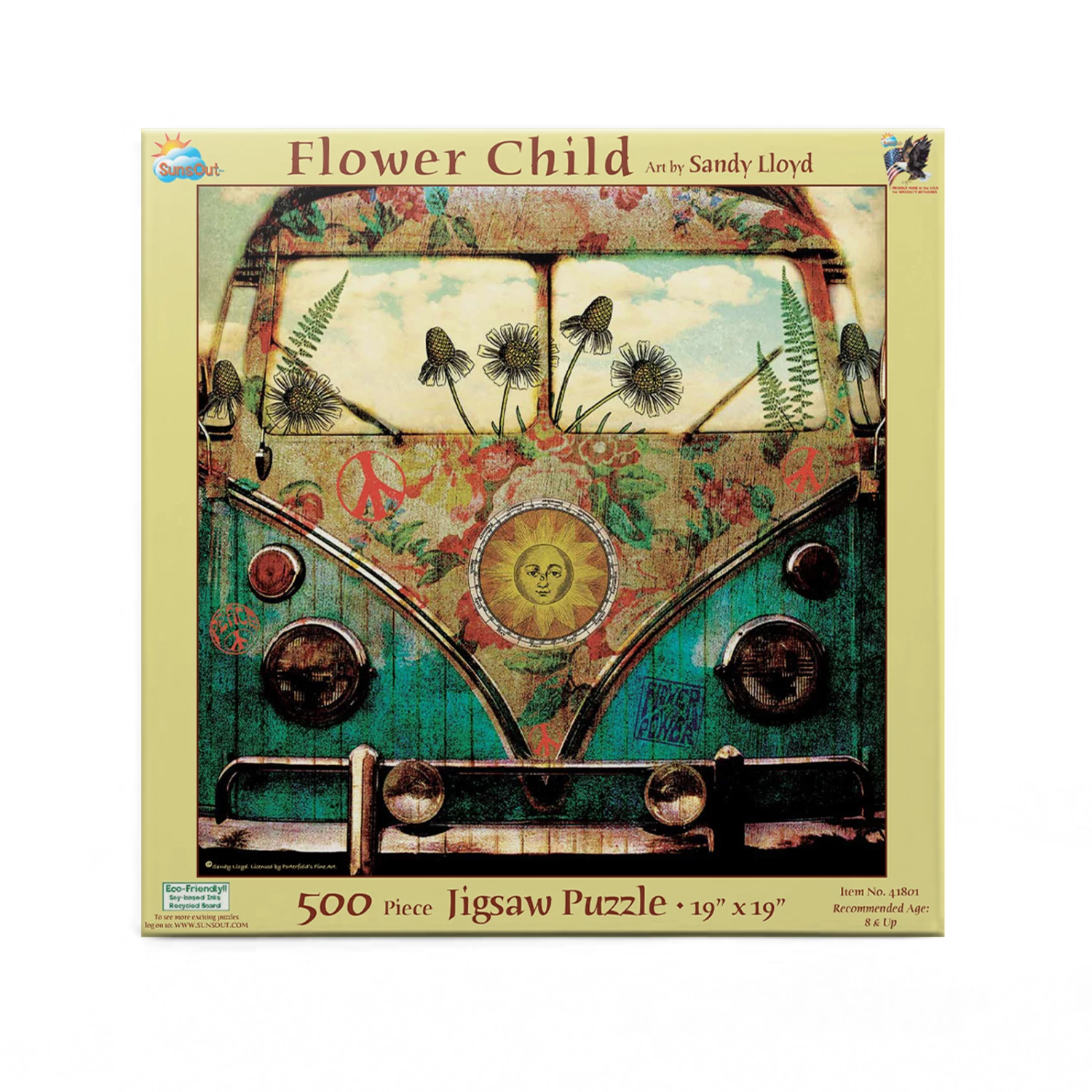 Peace out with this fun vintage inspired puzzle from SunsOut. Celebrate the 60βs with boho vibes in βFlower Childβ with artwork from Sandy Lloyd. The completed 500 piece puzzle will measure 19β x 19β.Β
