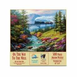 A train makes its way across a bridge bringing logs to the mill in this 500 piece puzzle. Artist Sung Kim has added beautiful purple flowers to the landscape creating a fun and bright image. This puzzle would be great for puzzlers of any skill level, especially ones that like trains! The completed 500 piece puzzle will measure 24โ x 18โ.ย