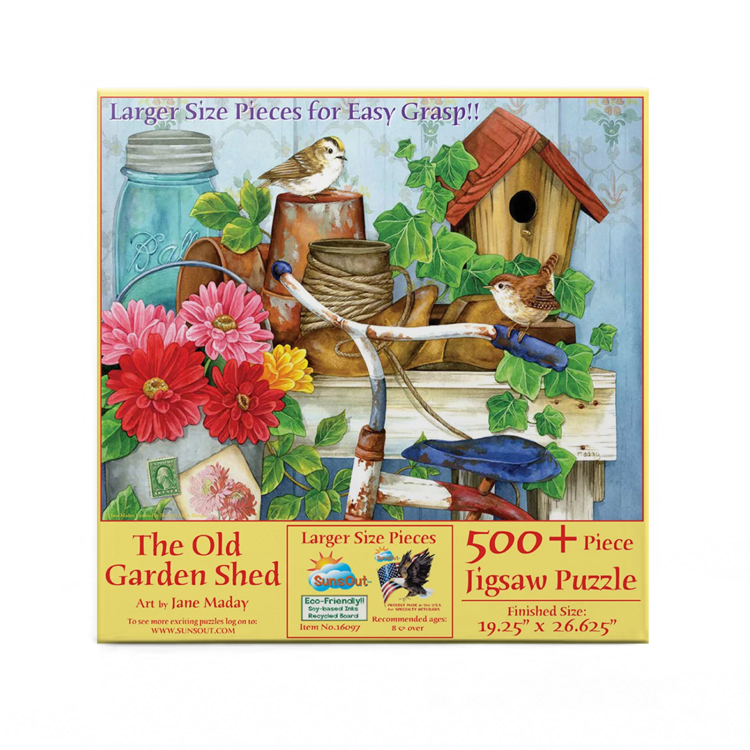 What can you find in the old garden shed? This puzzle will show you! Birds have made their way in and are nesting in the birdhouse. A rusty childrenβs bike is a nice place for the birds to perch and take a rest. The brightly colored artwork comes from Jane Maday. The completed 500 piece SunsOut jigsaw puzzle will measure 26.625β x 19.25β and features larger piece size for easy handling.