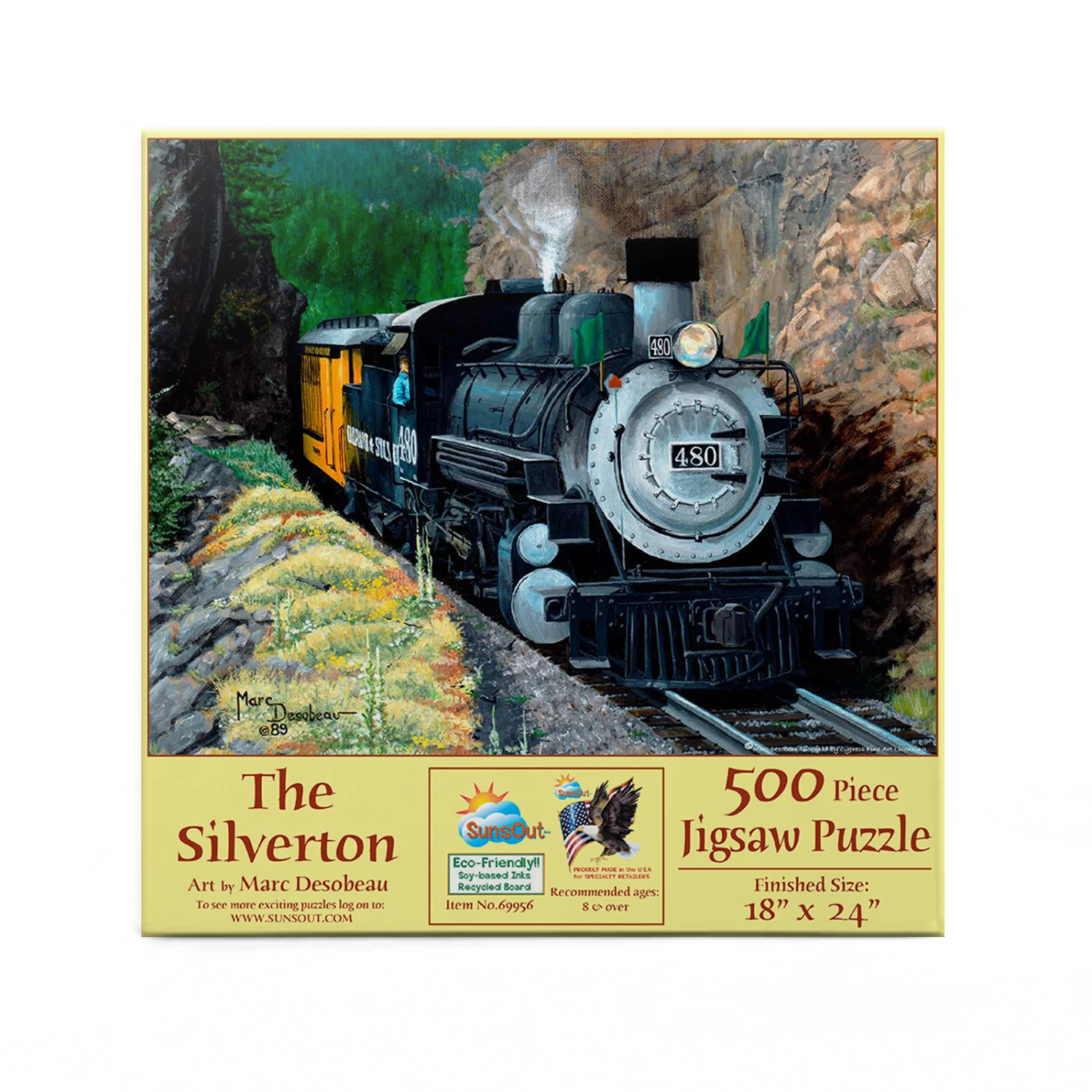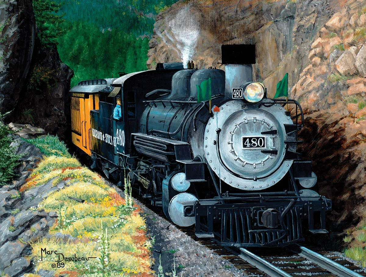 All Aboard! A train makes its way through a pine forest and between cliffs in this fun 500 piece puzzle from SunsOut. Artist Marc Desobeau brings you right to the scene with his beautiful artwork. The completed image will measure 18” x 24”.