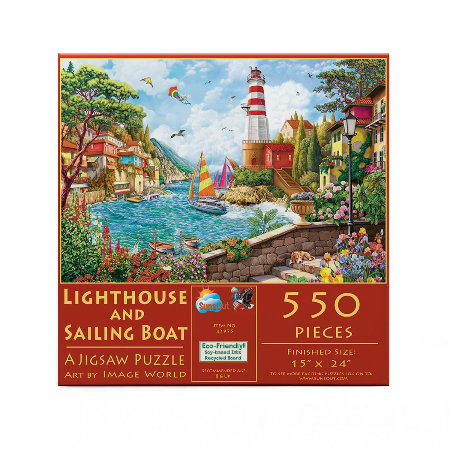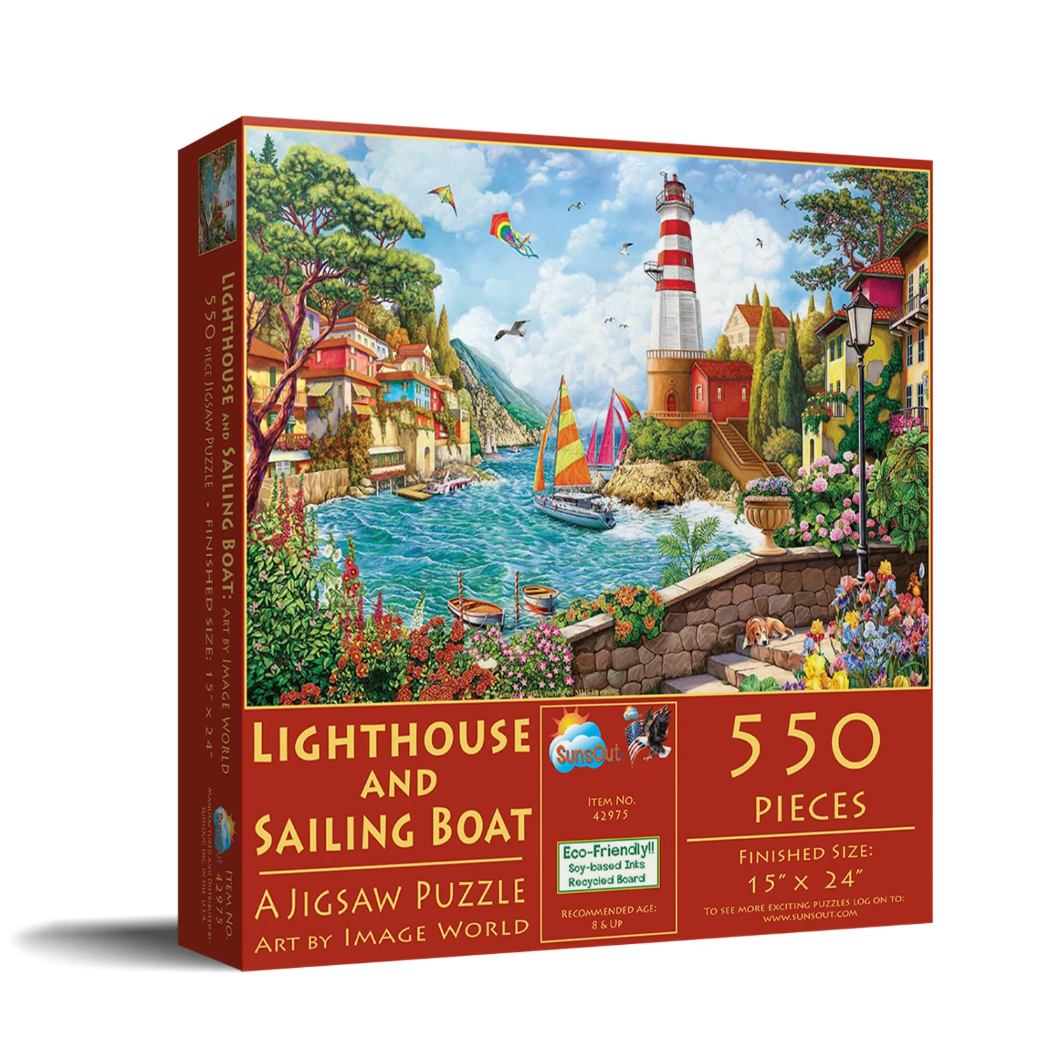 In this 550 piece jigsaw puzzle from Sunsout, it’s a perfect day on the sea for a sailboat ride. Β Enjoy this wonderful nautical view of a coastal town and the lighthouse that guards it. The artwork for this puzzle comes from Image World. The completed 550 piece puzzle will measure 24″ x 15″.