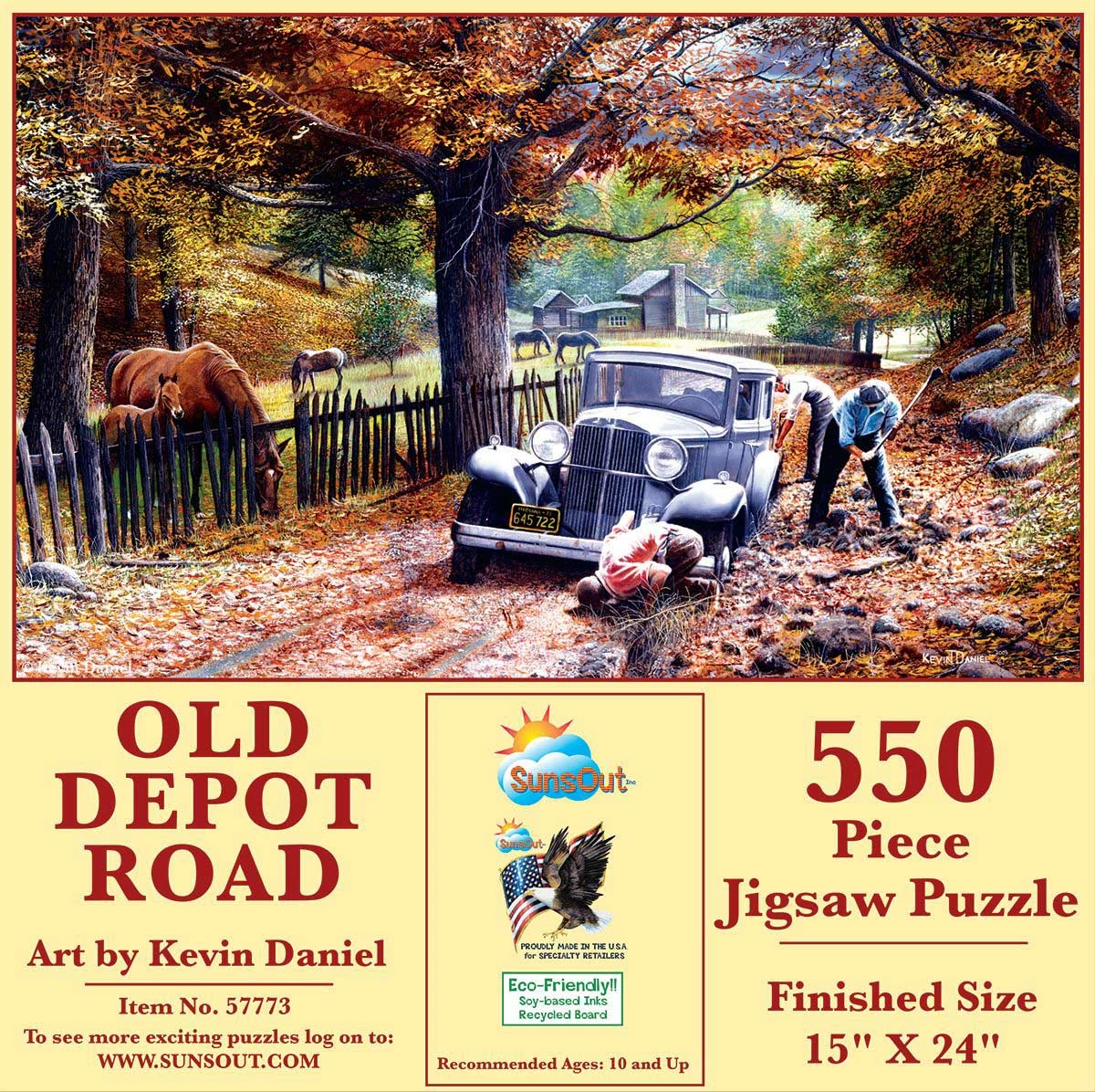 In this 550 piece jigsaw puzzle from Sunsout, an old depot road is hardly a place to have a car break down, but these men are hard at work getting this vehicle un-stuck! Β With artwork from Kevin Daniel, this puzzle will be a fun one to put together!Β