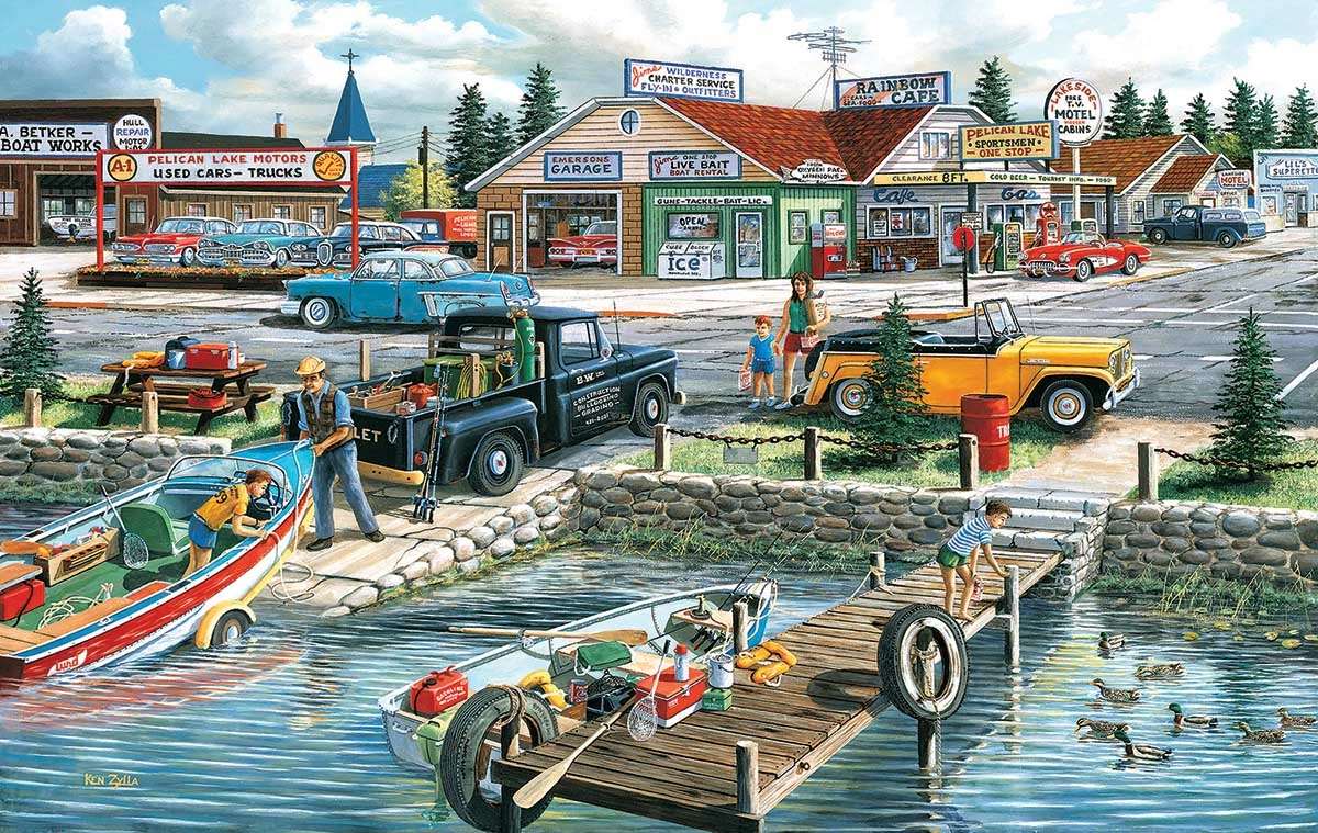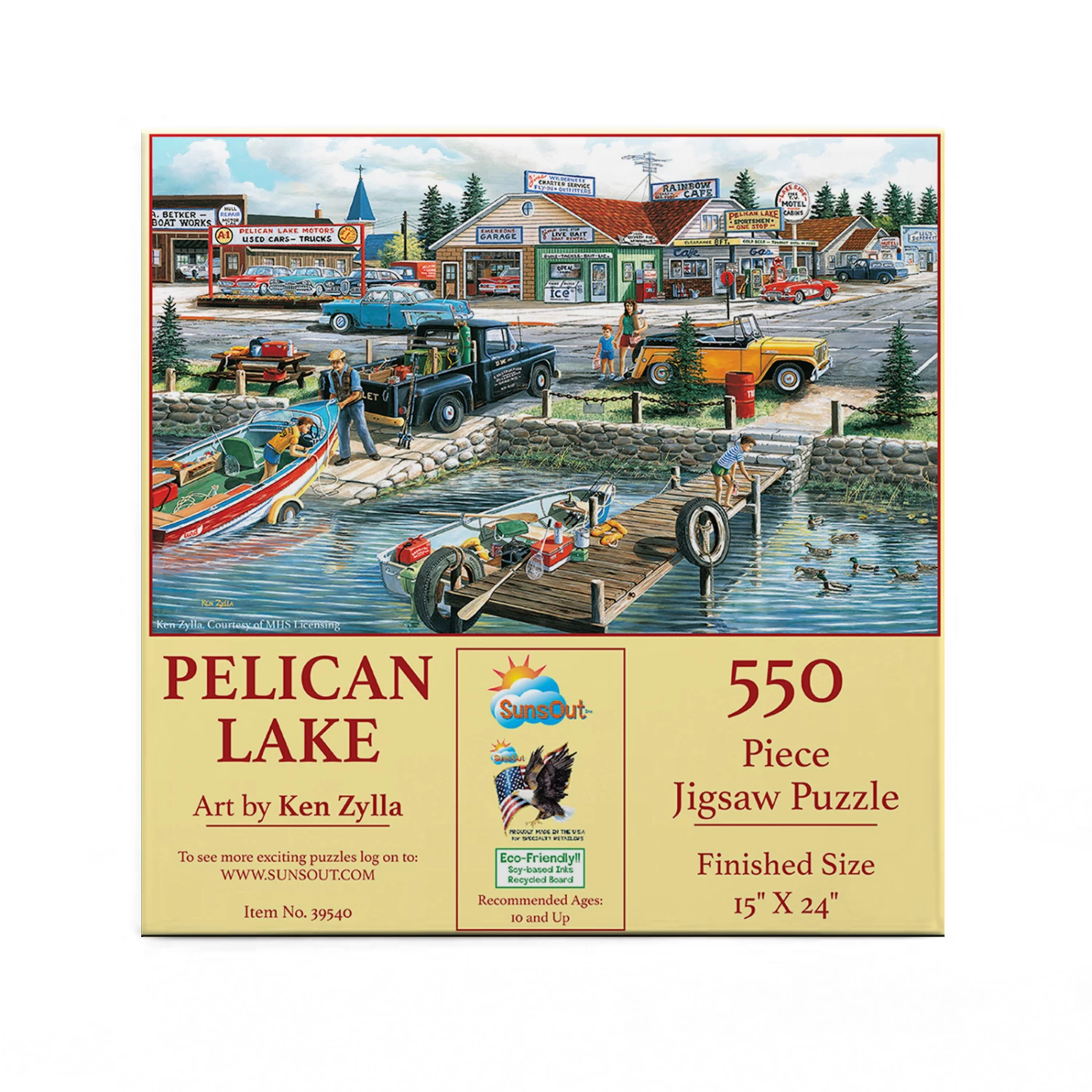 A busy boat launch is pictured in โPelican Lakeโ from SunsOut. Featuring the nostalgic artwork of Ken Zylla, this 550 piece puzzle is a great gift for Christmas or Fatherโs day, especially if they enjoy fishing! The completed puzzle will measure 24โ x 15โ and would be great for puzzlers of all ages and abilities.ย