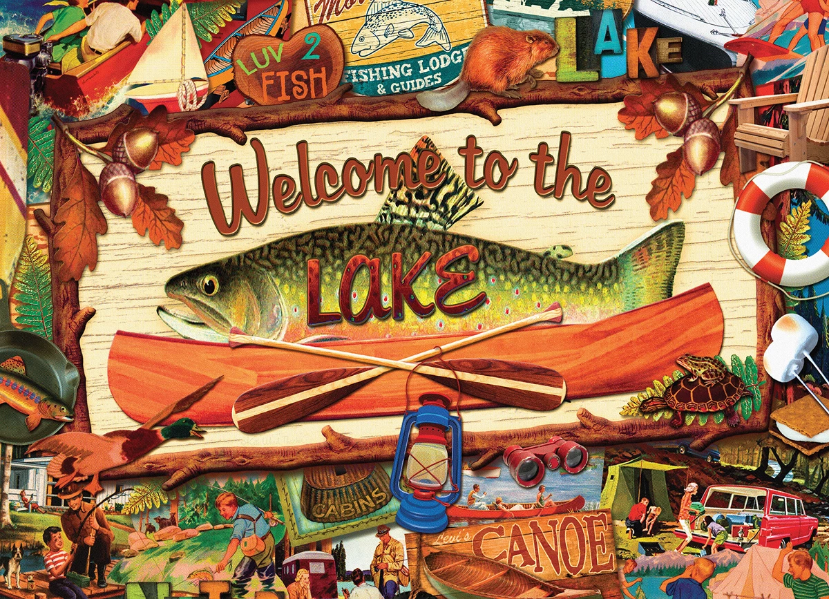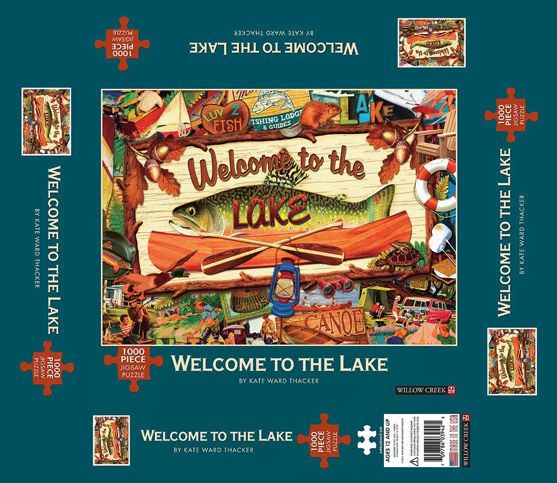Artist Kate Ward Thacker’s delightful collage reminds us of the timeless, simple joys of lake living. Proudly made in the U.S.A., the 1000 precision cut, fully-interlocking pieces are poly-bagged for protection inside an attractive 12″ x 10β box. Β Completed puzzle measures 26.625″ x 19.25β.